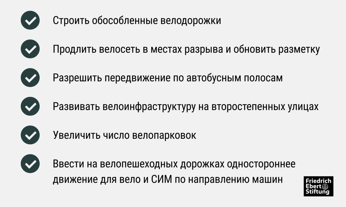 Как местные, так и международные эксперты в один голос советуют развивать современную и устойчивую велоинфраструктуру, в том числе за счет сокращения числа автомобильных полос и превращения пространства в велодорожки. Так, для горожан на велосипеде или самокате поездки станут удобными и безопасными, а пешеходам не придется отстаивать право на тротуары.
