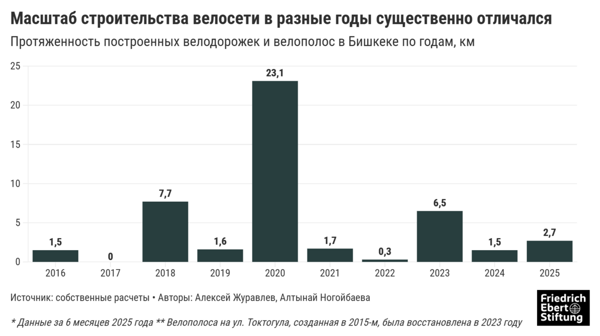 Но наиболее активное строительство началось в 2020 году. Пока горожане переживали локдаун и другие ограничения, связанные с пандемией коронавируса, городские службы прокладывали «‎кольцевую» сеть веломаршрутов. Работы велись на проспектах Чуй и Манаса, на улицах Абдрахманова, Тыналиева и в других локациях. Всего за тот год появилось около 23 километров велоинфраструктуры, в основном обустроенной на тротуарах.