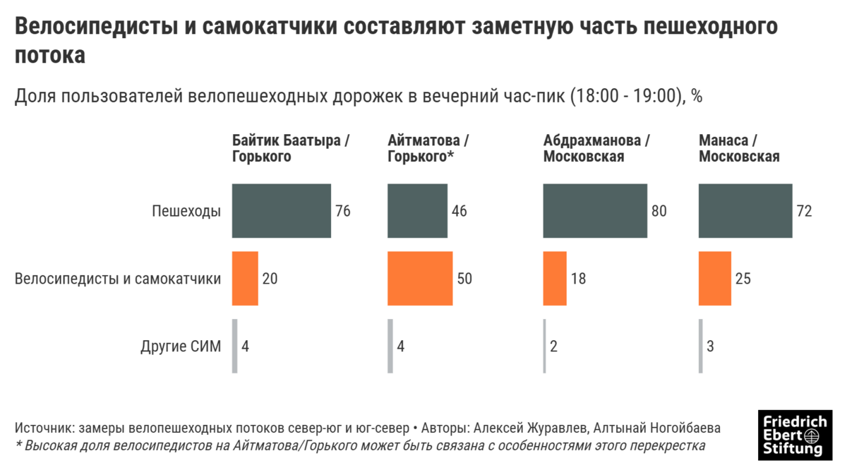 При этом, даже на обычных тротуарах, доля велосипедистов и СИМ в вечерний час-пик существенна — в среднем около 14%.