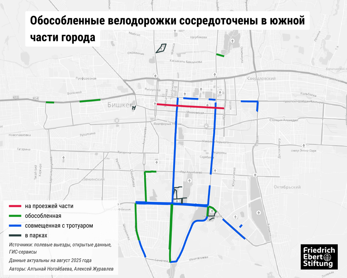 Городские исследователи при поддержке Представительства Фонда им. Фридриха Эберта изучили, как развивалась бишкекская велоинфраструктура в течение последних 10 лет, и как обстоят дела сейчас.