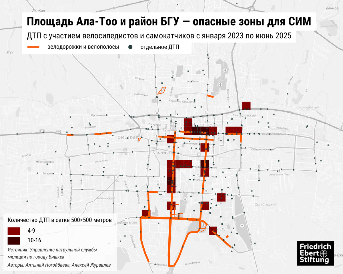 Мы выяснили, что аварии происходят повсеместно — как в центре Бишкека, так и в отдаленных районах и жилых массивах города. При этом есть несколько зон, в которых происходило наибольшее число ДТП. Среди них: районы площади Ала-Тоо и Бишкекского государственного университета, отрезок улицы Байтик баатыра от Кулатова до Горького.