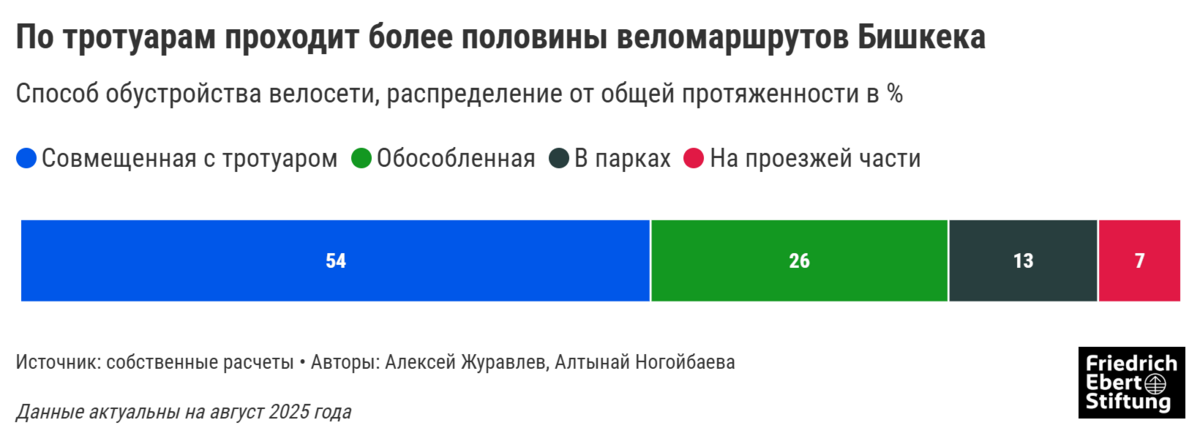 Сейчас, согласно нашим подсчетам, велопешеходные дорожки составляют 54% от общей протяженности столичной велосети.